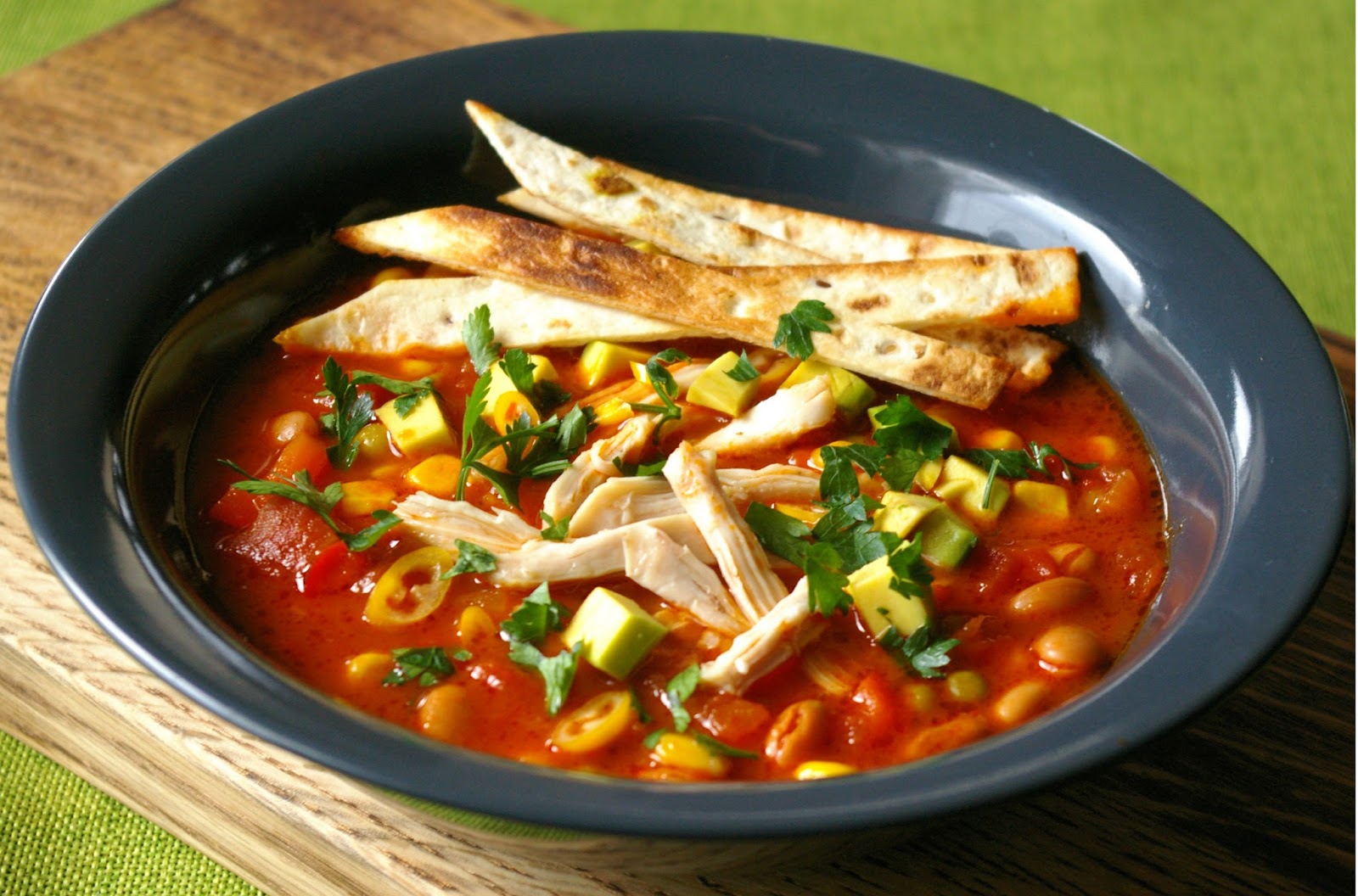 - Po nałożeniu do talerzy dodać do każdej porcji kawałki kurczaka, posiekane chili i natkę kolendry oraz awokado pokrojone w kostkę. Tortillę pokroić w paski i podsmażyć na suchej patelni - również dodać do talerza z zupą.